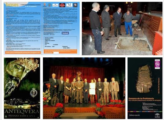 – El cartel de la Semana Santa de 2014 de Antequera y instantánea de la agrupación de cofradías en dicha presentación.