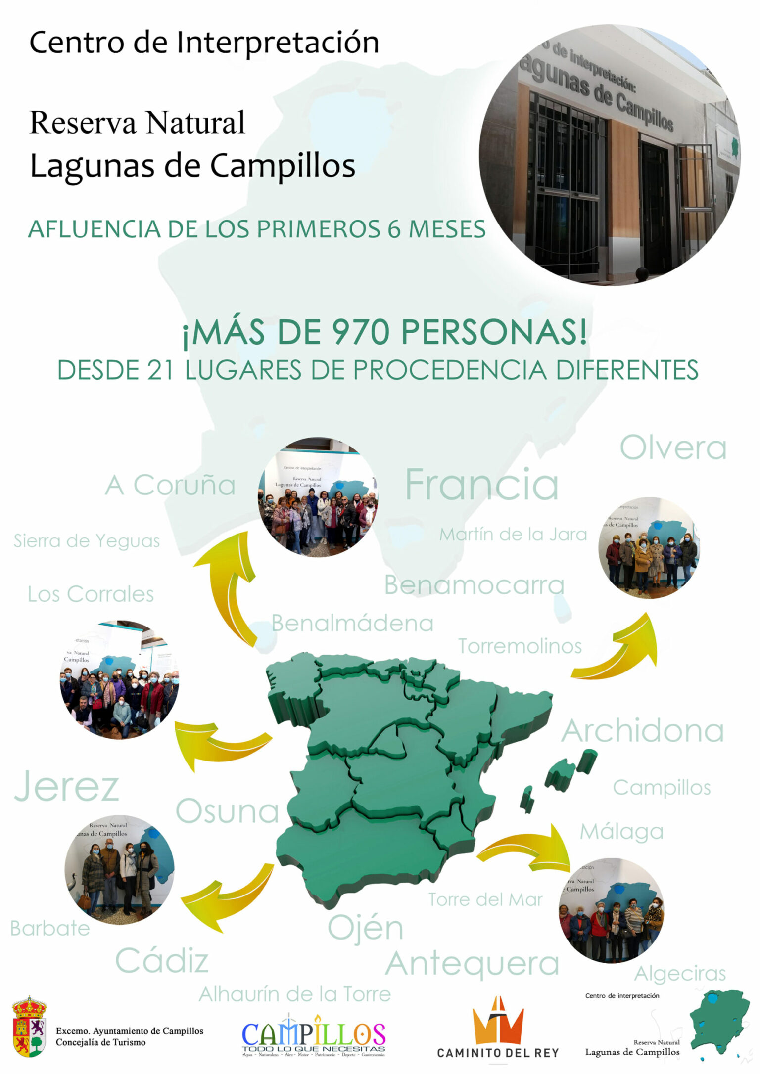 El Centro de Interpretación Reserva Natural Lagunas de Campillos cumplió seis meses el pasado 4 de diciembre y en este tiempo ha visto pasar por sus instalaciones a cerca de 1.000 visitantes. Concretamente, han sido 970 personas de 21 lugares diferentes las que se han acercado al centro para conocer muchos de los secretos y peculiaridades que esconden las lagunas de Campillos.