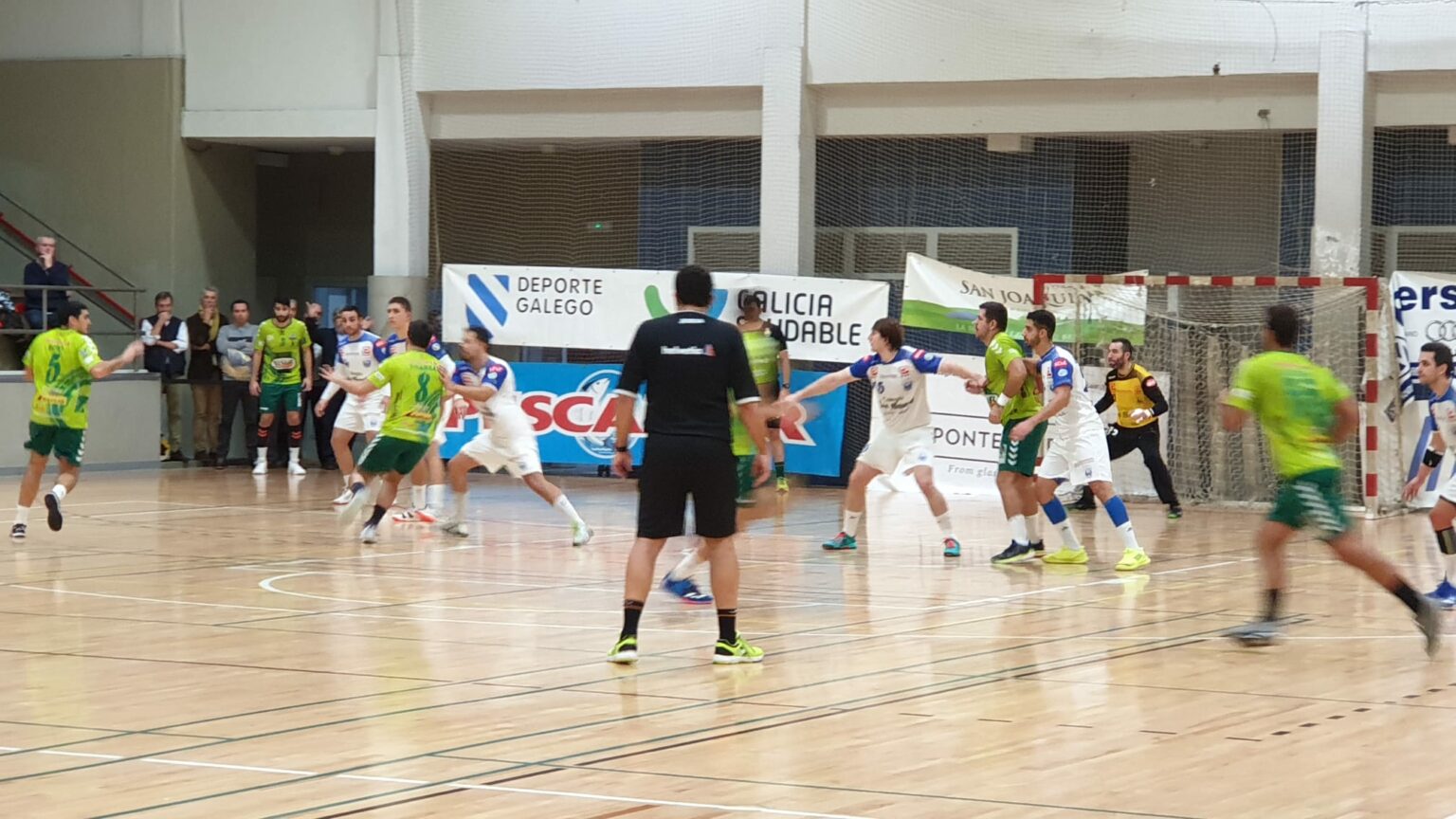 Durante los primeros 15 minutos del encuentro, los de Antequera se mantuvieron por encima en el marcador, pero a partir del minuto 20’ los gallegos empezaron a tomar distancia en base a contraataques rápidos que llegaron a sorprender a los jugadores blanquiverdes. De esta forma se alcanzó el final de la primera mitad con ventaja de cuatro goles (13-9).
