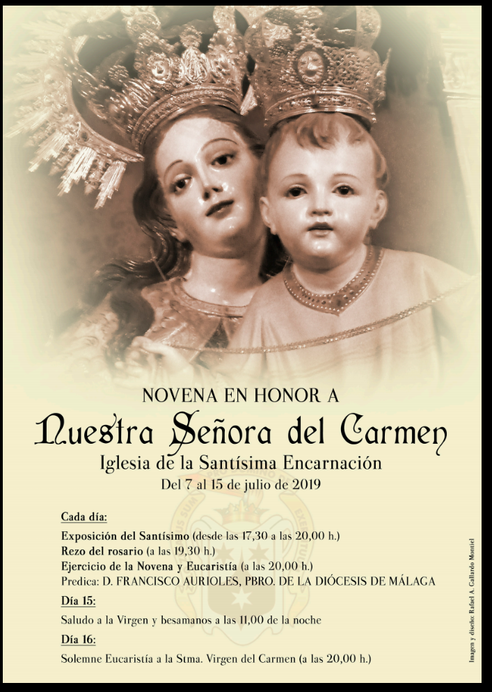 Cada día, del 7 al 15 de julio, tendrá lugar de 17.30 a 20.00 horas exposición del Santísimo. A las 19.30 horas, rezo del Santo Rosario, así como a las 20.00 horas Ejercicio de Novena y Eucaristía, la cual estará predicada por don Francisco Aurioles, presbitero de la Diocesis de Málaga.