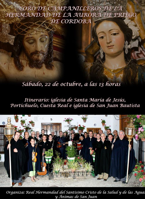 Ha sido deseo de dicha Hermandad de la Aurora ofrecer una actuación de su Coro de Campanilleros, que comenzará a las una de la tarde en la iglesia de Santa María de Jesús, ante la Virgen del Socorro, y recorrerá el Portichuelo, la Cuesta Real, culminando en la iglesia de San Juan, ante la imagen del Patrón de Antequera.