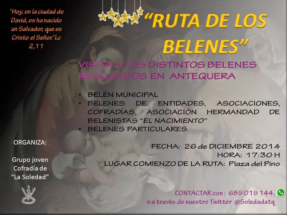 El Hermano Mayor, Luis Moreno,  y el Vocal de Juventud, José Carlos Jiménez, informan que el grupo joven de la Cofradía de la Soledad, organiza para el viernes 26 una ruta de los Belenes por Antequera, para todos los que quieran acompañarles, jóvenes y menos jóvenes.