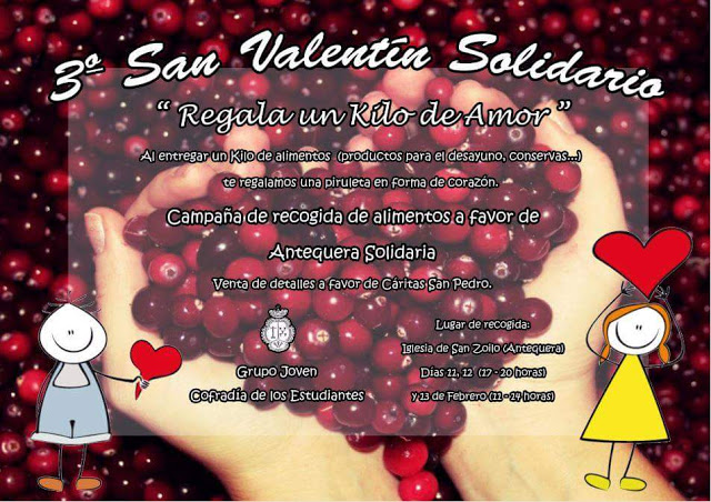 Por tercer año consecutivo, el Grupo Joven de la Cofradía de los Estudiantes de Antequera, pone en marcha la iniciativa de “San Valentín Solidario” con el lema “Regala un Kilo de Amor”. De esta manera quieren convertir esta fiesta en un día de amor solidario, un día en el que no se puede olvidar a todos aquellos que lo están pasando mal.