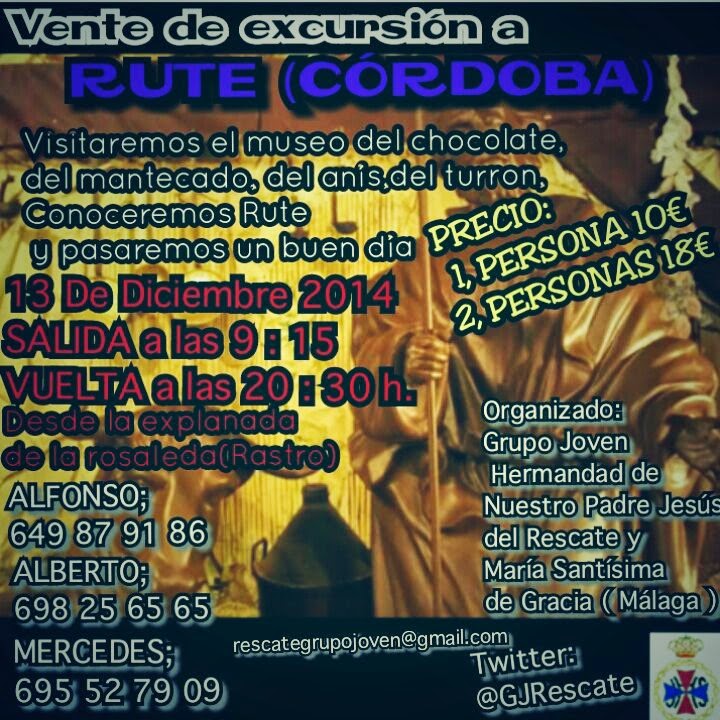 El Grupo Joven de la Hermandad de Nuestro Padre Jesús del Rescate y María Santísima de Gracia de Málaga, organiza viaje a Rute donde se visitará el museo del chocolate, del mantecado, del anís y del turrón. Precio de 1 persona 10 euros, 2 personas 18 euros.