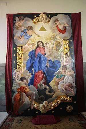 En el mismo aparece una ruptura de la tradicional «Gloría», centrandose en la Inmacualada franciscana, vestida de rojo y azul, sosteniendo al Niño. Ambos sujetan una lanza cruciforme que hunden en el cuerpo de la serpiente. Están rodeados de ángeles, 8 pintados y 4 de barro policromado, de molduras talladas y de piezas de orfebrería. Es una composición de quadratura, para mirar de abajo a arriba, en la que se juega con el ilusionismo, la perspectiva, los puntos de fuga, sin renunciar a la filosofía barroca. Así ha diseñado el pintor realista de este celaje que cubrirá a la Virgen, rompedor con la estética clásica desde el Siglo XIX y añejo en su concepción de recuperar estilismos antiguos.