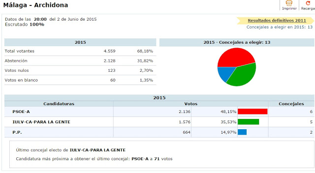 A pesar de confirmarse en los juzgados de Antequera el error en la transmisión de votos que quitaba la mayoría absoluta lograda en Archidona por el PSOE, la web del Ministerio del Interior sigue ofreciendo datos erróneos, al no ser modificados. El fallo estuvo en la transmisión de datos. El supuesto error se habría producido concretamente en la transmisión del recuento de 102 votos que pasaron de Izquierda Unida al Partido Popular. De este modo, el PSOE obtuvo definitivamente 2.137, IU, 1.678 sufragios y el PP, 562 votos.