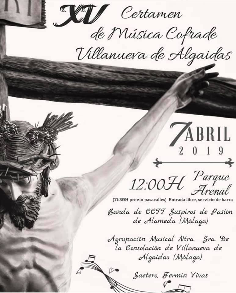 Este domingo 7 abril tendrá lugar el 15º Certamen de Música Cofrade en Villanueva de Algaidas en el Parque del Arenal a partir de las 12.00 horas. Previamente habrá pasacalles a partir de las 11.30 horas.