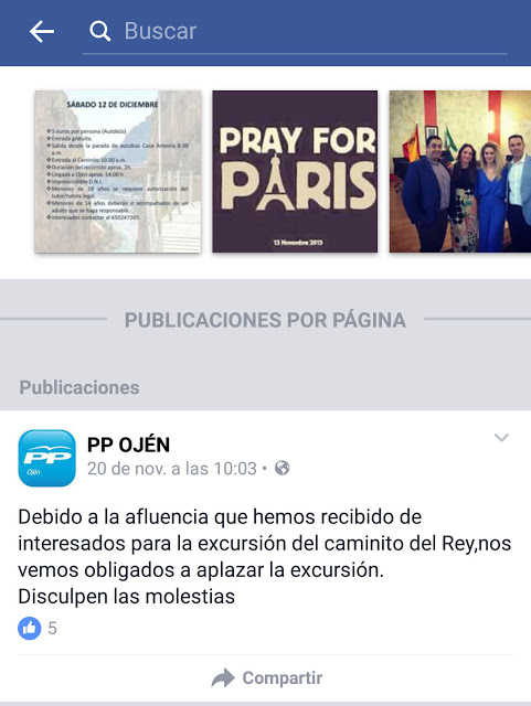 Los socialistas denuncian que el PP de Ojén publicó el jueves 19 de noviembre en su Facebook un cartel anunciando una excursión al Caminito del Rey para el sábado 12 diciembre. “El teléfono de contacto que aparecía corresponde al del concejal del PP de Ojén, candidato a la Alcaldía en las pasadas elecciones y líder del PP de Ojén, Juan Merino”, según asegura en un comunicado el PSOE.