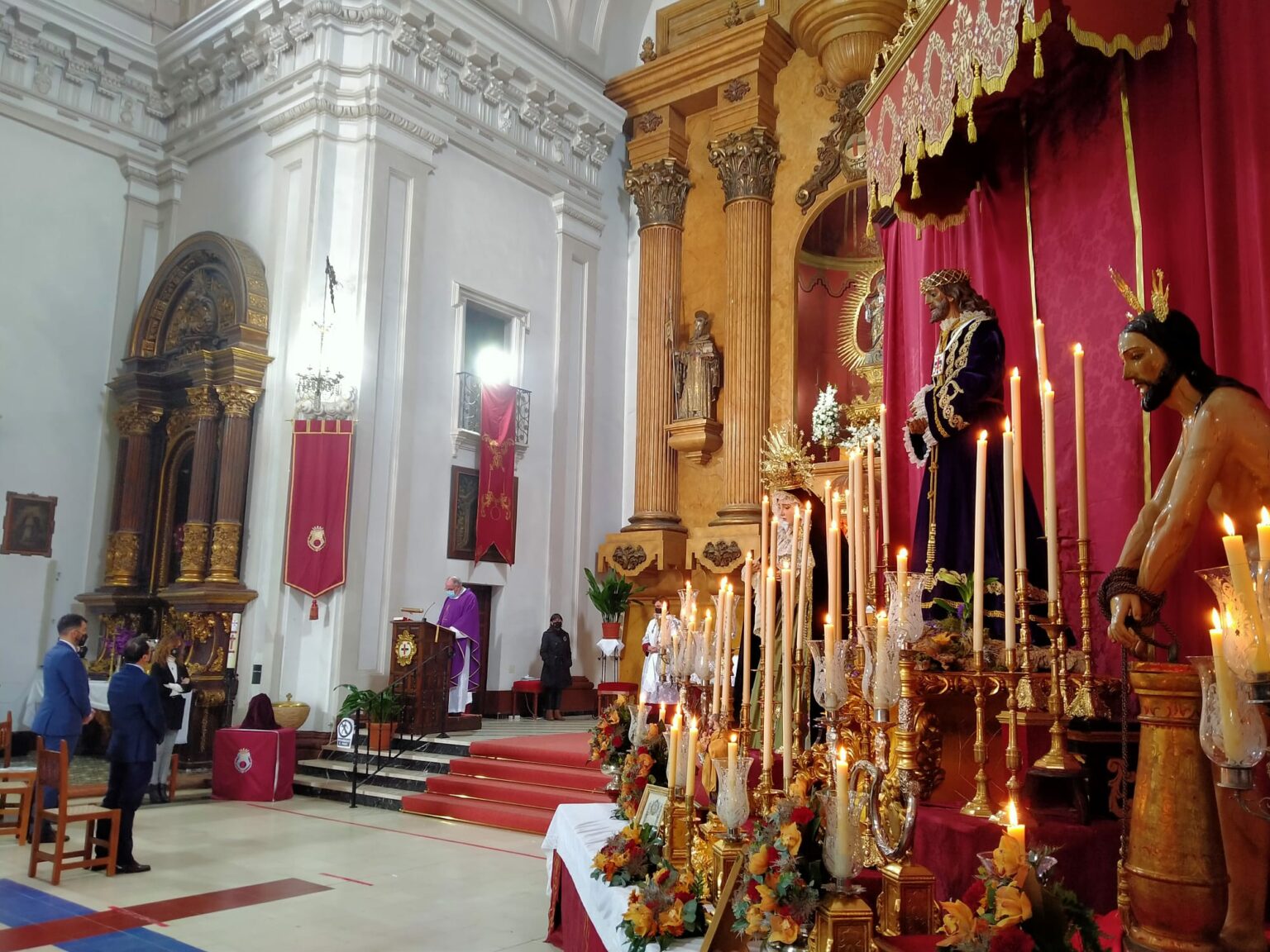 Los cultos han dado comienzo este domingo por la mañana a mediodía en la iglesia de la Trinidad, ante un templo abarrotado de fieles con distanciamiento y las medidas preventivas ante el Covid. Un domingo que, ha sido diferente, ya que tras la misa, no se ha celebrado el Pregón del Martes Santo, que tendría que haber sido llevado a cabo por el hermanaco Javier García Quintana, y que ha sido pospuesto para el próximo año.