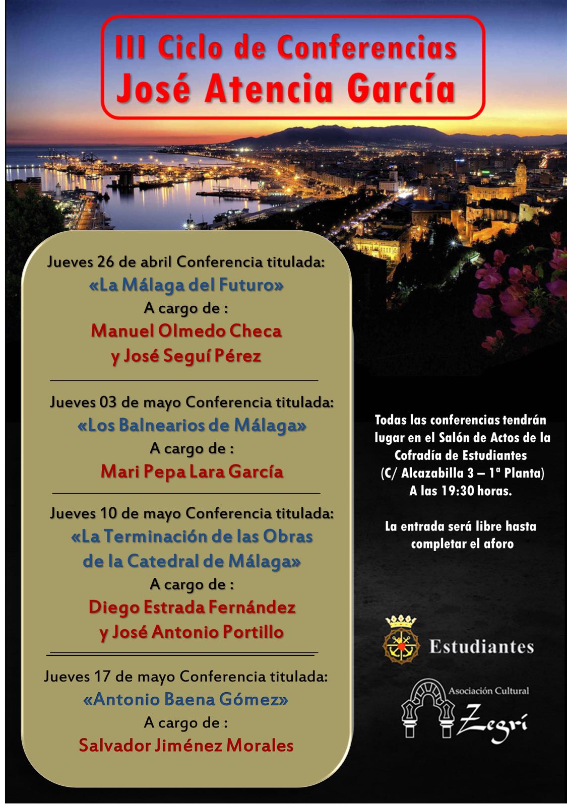 La Hermandad del Santo Cristo Coronado de Espinas y María Santísima de Gracia y Esperanza “Estudiantes” de Málaga junto con la Asociación Cultural Zegrí y la Universidad de Málaga organizan el tercer ciclo de conferencias “D. José Atencia García”.