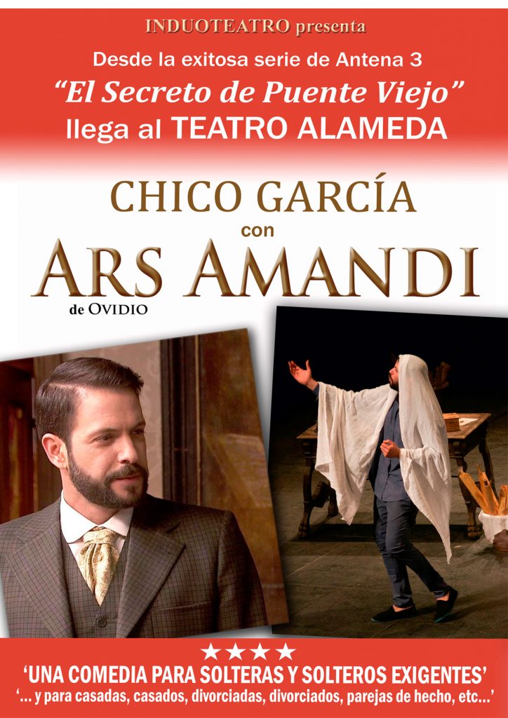 Chico García protagonista de la exitosa serie de Antena 3 Televisión “El secreto de Puente Viejo” recupera a uno de los primeros poetas de nuestra historia, Ovidio, y su tratado sobre el “arte de amar” con un humor y una picaresca excepcionales y dirigido a solteras y solteros y casados y casadas exigentes. Chico García protagoniza, escribe y co-dirige (esto último junto a Andreu) un montaje que se inspira en el primer tratado sobre la igualdad de género de todos los tiempos.
