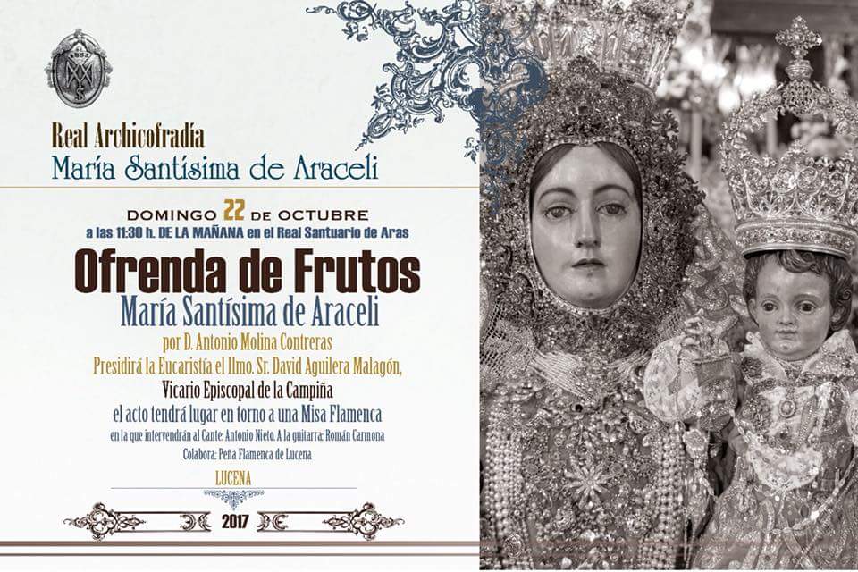 Como es tradicional por estas fechas, el domingo 22 de octubre se realizará una misa flamenca en el Santuario de la Virgen de Araceli, patrona de Lucena y del Campo Andaluz, durante la que tendrá lugar la ofrenda de frutos a la Santísima Virgen para la bendición de nuestros campos y cosechas. A su término, como todos los domingos, se abrirá el camarín de la patrona.