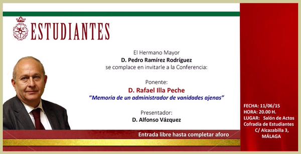 La Cofradía informa que el próximo jueves 11 de junio, a las 20.00 horas tendrá lugar la Conferencia “Memoria de un Administrador de vanidades ajenas” en el Salón de Actos de la Casa Hermandad, ubicada en C/Alcazabilla, 3.