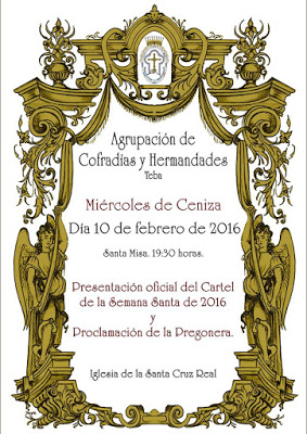 El próximo Miércoles de Ceniza, 10 de Febrero, a las 19.30 horas se presentará el cartel de la Semana Santa de 2016 de Teba y se proclamará a la pregonera, en la Iglesia de la Santa Cruz Real.