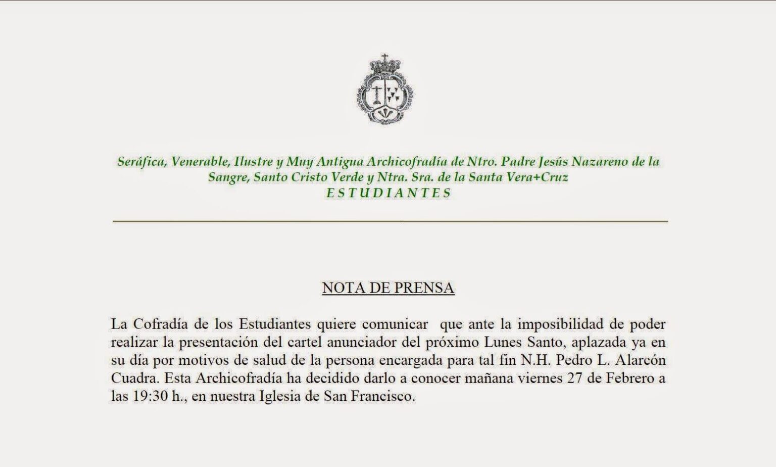 La Archicofradía de los Estudiantes de Antequera, comunica que ante la imposibilidad de poder realizar la presentación del Cartel Anunciador del próximo Lunes Santo, ha decidido darlo a conocer este Viernes 27 de Febrero por la tarde en su templo sede.