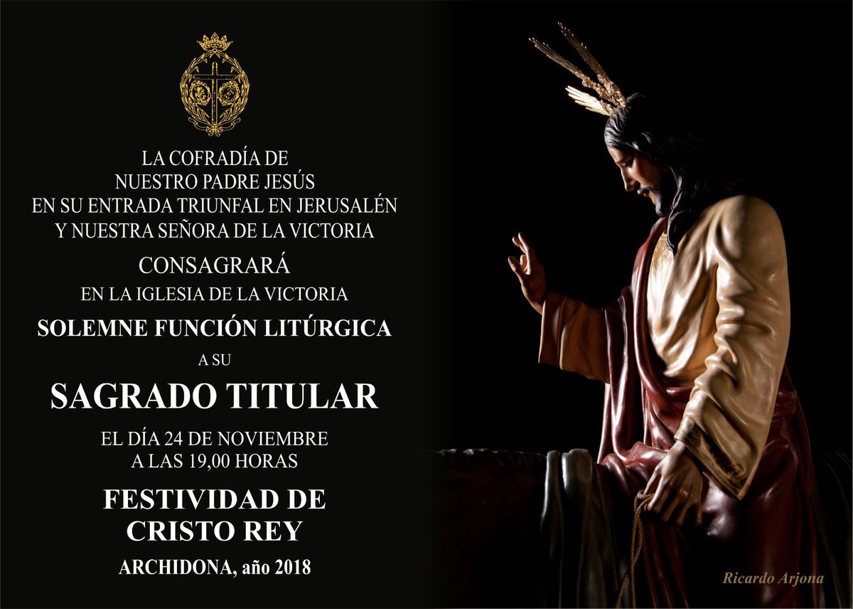 La Cofradía de Nuestro Padre Jesús en su entrada triunfal en Jerusalen y Nuestra Señora de la Victoria organiza función litúrgica a su Sagrado Titular el próximo sábado 24 de noviembre a las 19.00 horas con motivo de la Festividad de Cristo Rey. La celebración tendrá lugar en la iglesia de la Victoria.