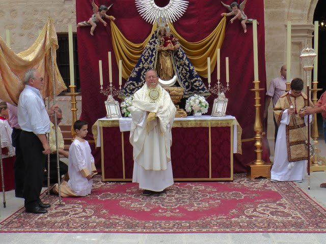 A las doce del mediodia comenzaba la Función Religiosa celebrada por el párroco don Tomás Pérez Juncosa tras la cual comenzaba la procesión del Santisimo por las naves del templo hasta salir por la puerta lateral a Cuesta Real, el cortejo continuó entrando a la nueva plaza remodelada de San Juan donde la Hermandad montó el Altar muy parecido al que este año montaron con motivo del Corpus en calle Lucena.