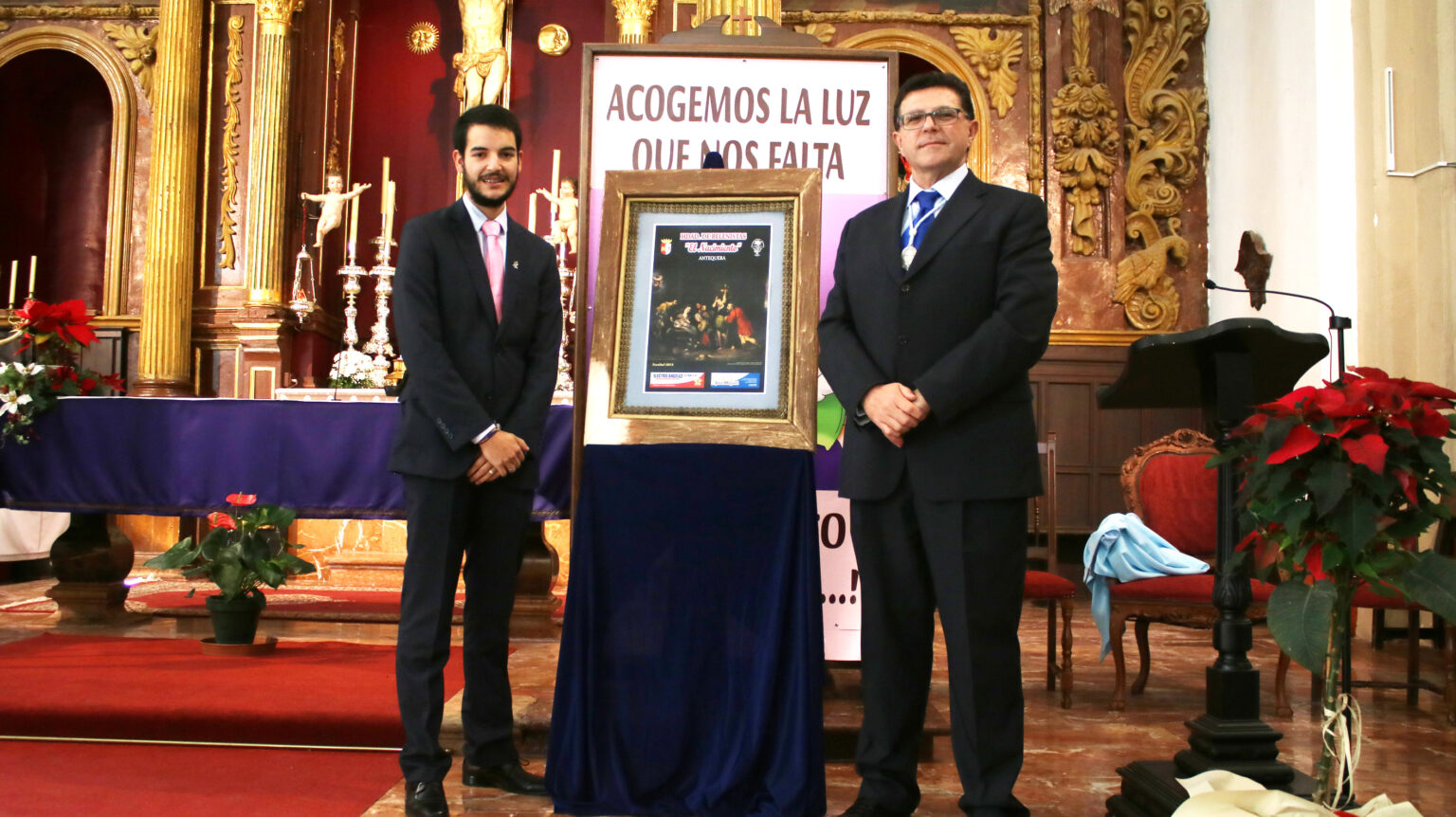 La Hermandad de Belenistas ‘El Nacimiento’ de Antequera presentó esta tarde en la iglesia de San Pedro el cartel para este año, a cargo del joven cofrade Francisco Arcas Marín quien recogió el testigo de la presentadora del año pasado, María Rosales.