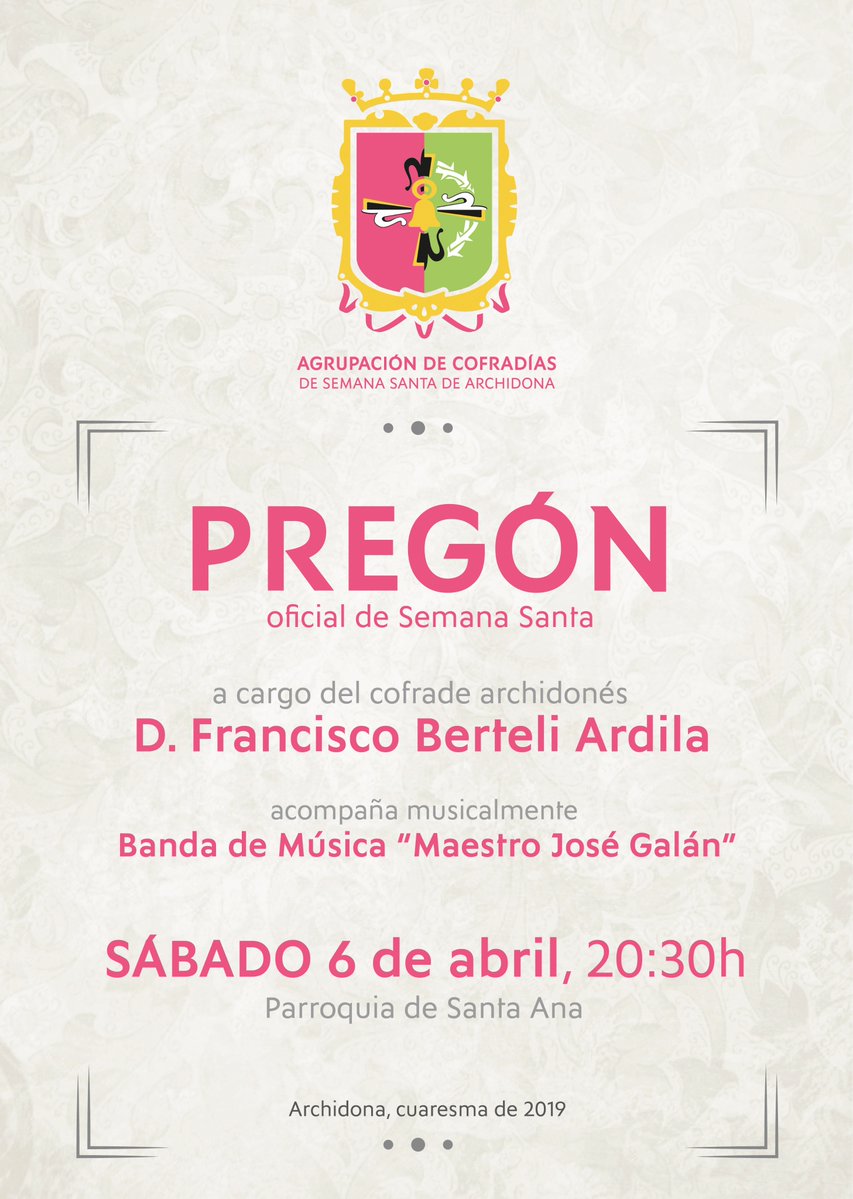 El cofrade archidonés Francisco Berteli Ardila, será el encargado en este 2019 de pronunciar el pregón este sábado 6 de abril a las 20:30 horas en la Iglesia Parroquial de Santa Ana.