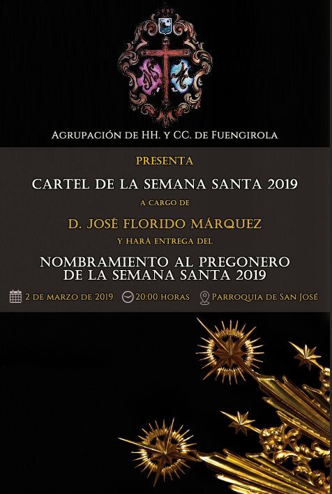 Durante el acto además de conocer el cartel a cargo de José Florido Marquez se hará entrega del nombramiento al pregonero de la Semana Santa 2019.