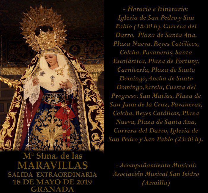 Su salida está prevista a las 18.00 horas con un recorrido por el casco histórico, destacando su visita al barrio del Realejo para regresar de nuevo a su templo alrededor de las 23.00 horas. El acompañamiento musical correrá a cargo de la Asociación Musical San Isidro de Armilla.
