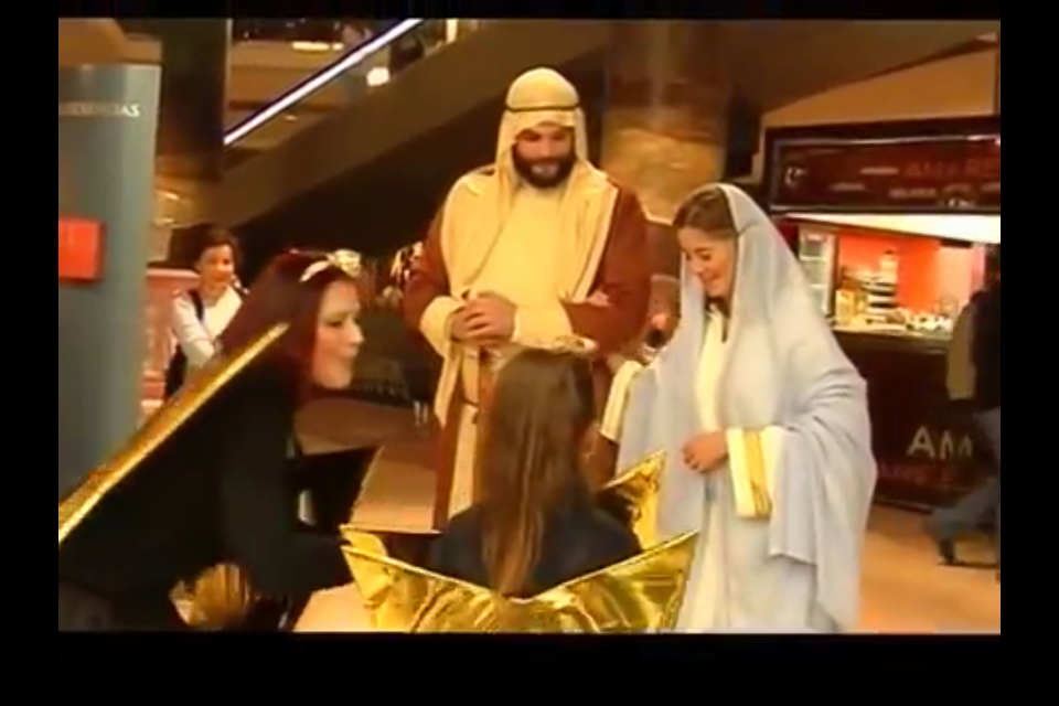 Los figurantes fueron trabajadores que dejaron sus puestos súbitamente en un momento de máxima concentración de clientes cuando comenzó a sonar un villancico en el hilo musical. Así, el punto de información se convirtió en una improvisada Posada a donde San José y La Virgen arrivaron en burro tras cruzar la galería de la planta baja del Centro Comercial La Verónica. Unas estrellas ‘humanas’ guiaron a la pareja hasta un puesto de castañeras, una lavandería y una tienda de chacina entre otros escenarios para finalmente parar bajo un arco, usado como expositor de jamones, y que se tornó portal para acoger el alumbramiento. Durante el devenir de la pareja, trabajadores portaron carteles con los valores que representan la filosofía de la cooperativa Eroski y empleados y clientes se fueron uniendo a la comitiva a la vez que bailaban y cantaban el mismo villancico que se reproducía en los altavoces del recinto.