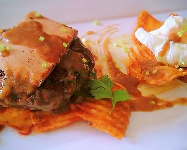 4. Una vez que tengamos las hamburguesas hechas añadimos el foie, que debe estar frío, ponemos la carne sobre las chips y añadimos el foie por encima. Por último añadimos la salsa.