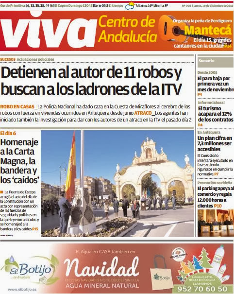 De nuevo los sucesos ocupan la apertura del periódico Viva Centro de Andalucía que, en su edición del día 10 de diciembre, narra los detalles de la detención del autor de once robos con fuerza perpetrados en Antequera para tranquilidad de sus ciudadanos. Igualmente relatamos los detalles del atraco de película vivido desafortunadamente por el persona de la oficina de la ITV de Antequera la semana pasada.