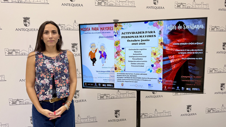 El Área de Familia y Mayores del Ayuntamiento de Antequera vuelve a abrir, un año más, su programación de actividades gratuitas especialmente diseñadas para nuestros mayores. La concejal delegada María Sierras informa sobre esta iniciativa que ofrece tres propuestas con gran aceptación en ediciones anteriores: Taller de memoria y estimulación cognitiva, que también trabaja la autoestima, la inteligencia emocional, manualidades, relajación ante el estrés y psicomotricidad, además de incluir salidas culturales. Será impartido por la psicóloga Raquel García Luque y comenzará en octubre. Las inscripciones se encuentran abiertas desde hoy martes 9 de septiembre hasta el 30 de septiembre en el Centro de Servicios Sociales de calle Picadero o llamando al 952 70 81 20.