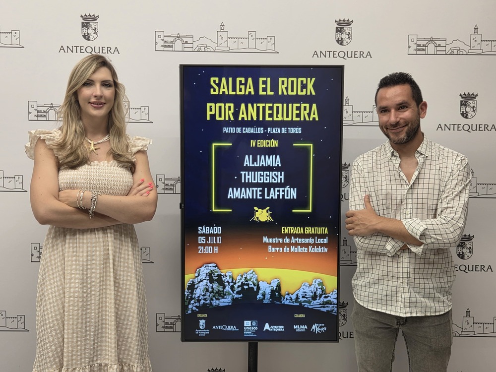 La concejal de Juventud del Ayuntamiento de Antequera, Marta González, ha presentado hoy en rueda de prensa una nueva edición de “Salga el Rock por Antequera”, festival ya consolidado como cita estival de referencia en la ciudad y que, un año más, contará con la participación de destacadas bandas de la escena musical alternativa y emergente. La edil ha estado acompañada por Ángel Peralta, en representación de la promotora antequerana MLMA Storm.