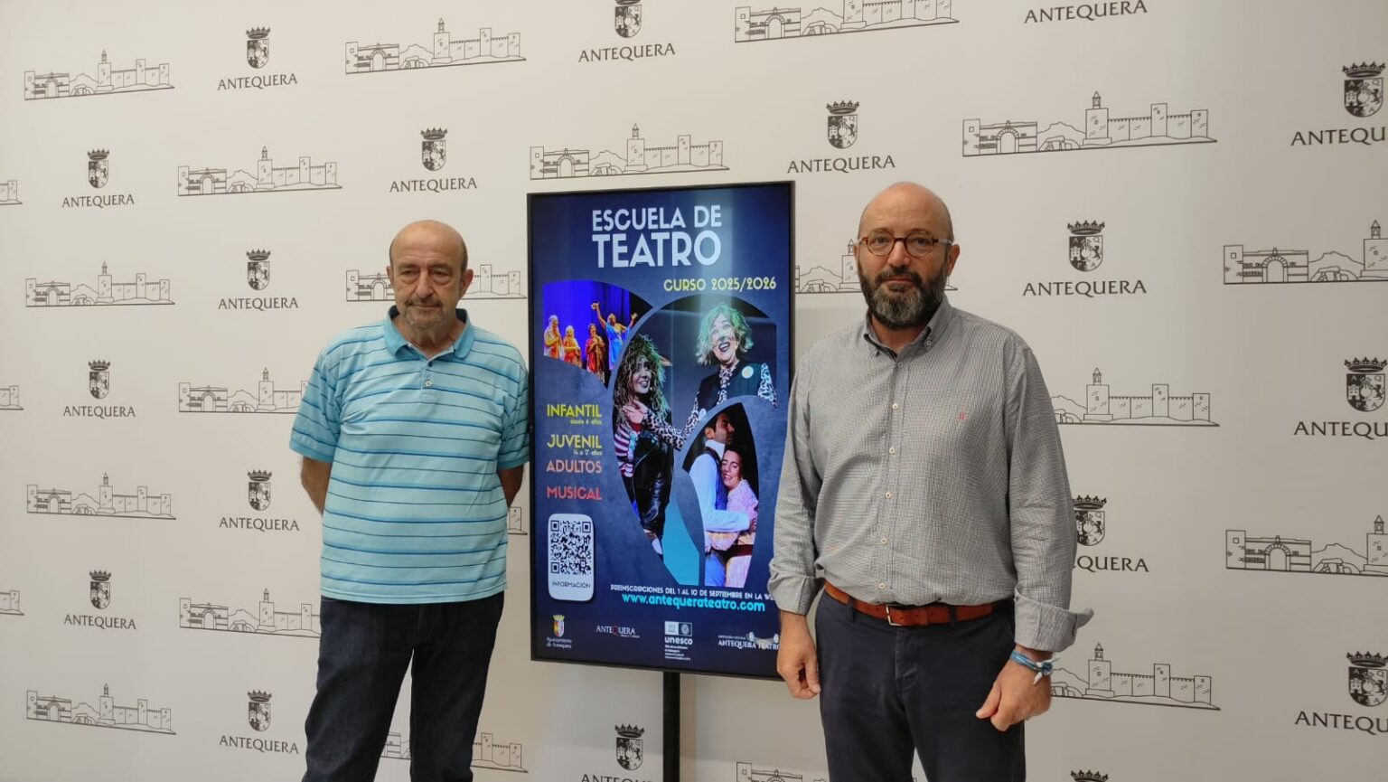 El concejal de Cultura, José Medina Galeote, y el secretario de la Asociación Antequera Teatro, Antonio Navarro, han presentado en la mañana de hoy el curso 2025/2026 de la Escuela Municipal de Teatro. Una iniciativa que, en palabras del edil, “responde al renovado interés que existe en Antequera por las artes escénicas, contando además con un equipo docente de gran calidad que impulsa la creatividad y la formación teatral en nuestra ciudad”.