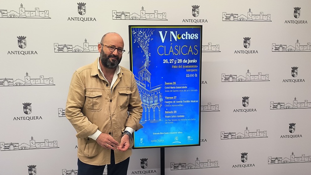 El concejal de Cultura del Ayuntamiento de Antequera, José Medina Galeote, ha presentado este miércoles 11 de junio una nueva edición de las Noches Clásicas, que alcanzan su quinta edición y tendrán lugar los días 26, 27 y 28 de junio a las 22:00 horas en el patio del Consistorio