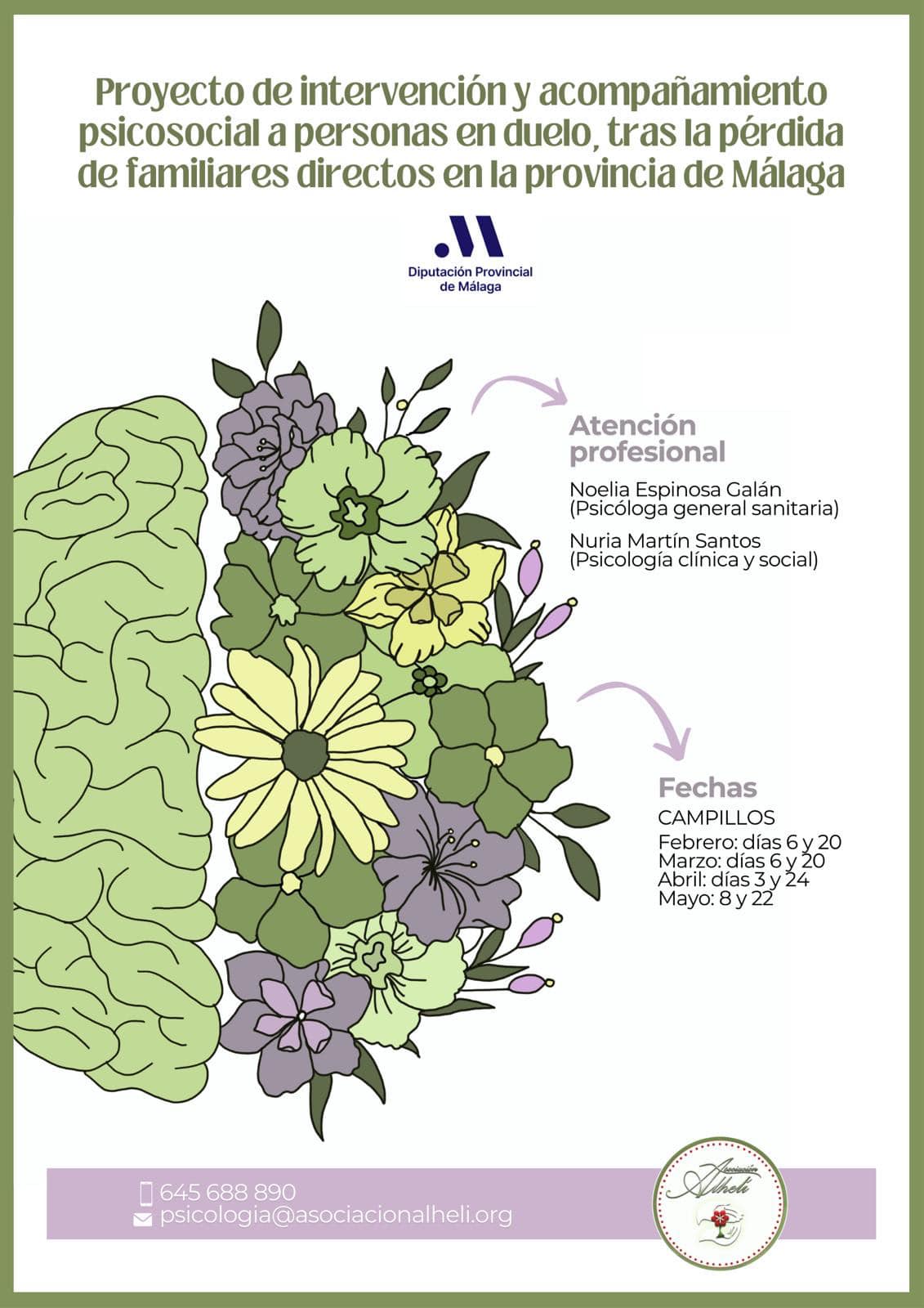 Campillos albergará durante los próximos meses un proyecto de intervención y acompañamiento psicosocial a personas en duelo tras la pérdida de familiares directos. Esta iniciativa será desarrollada por la Asociación Alhelí y cuenta con el respaldo de la Diputación de Málaga y la colaboración de la Concejalía de Derechos Sociales de la localidad.