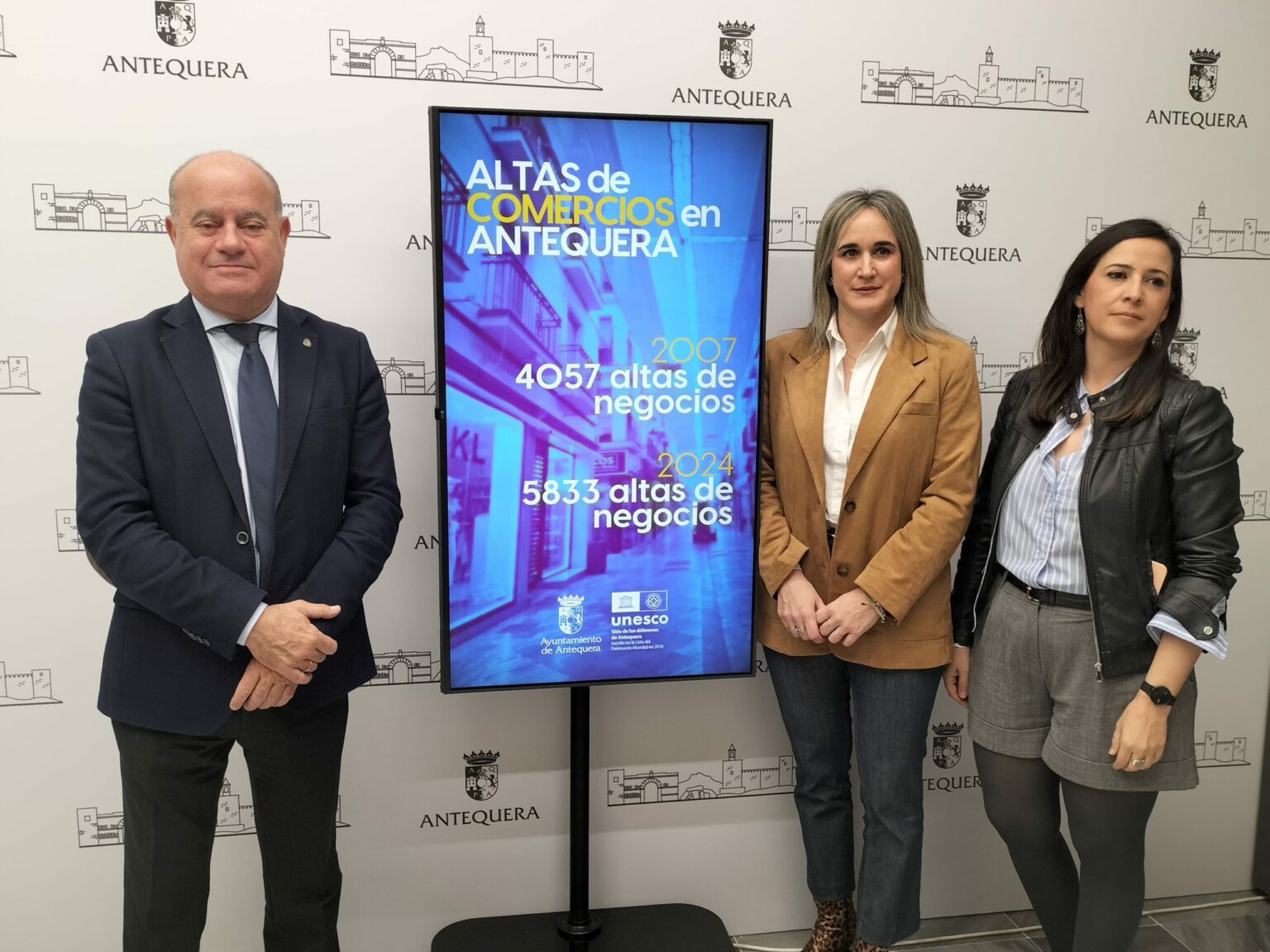 El Ayuntamiento de Antequera ha hecho públicos este jueves los datos oficiales de evolución del tejido comercial y empresarial de la ciudad. En una rueda de prensa celebrada en el Consistorio, el alcalde Manolo Barón, junto a la teniente de alcalde Ana Cebrián y la concejal Paqui Sánchez, ha ofrecido un balance que pone de relieve la evolución positiva del número de negocios dados de alta en Antequera, con cifras que desmienten la percepción de que en la ciudad predominan los cierres comerciales.