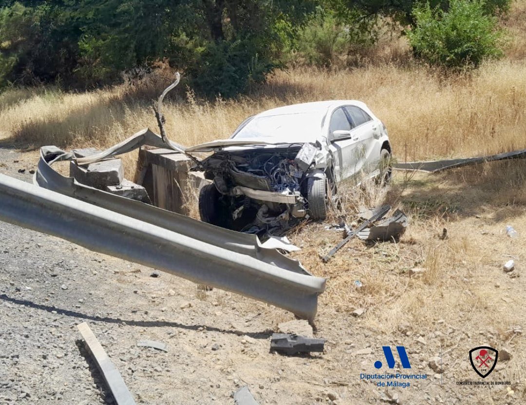 Dotaciones de Archidona y Antequera del Consorcio Provincial de Bomberos de Málaga intervinieron en el siniestro que ha terminado con la parte frontal del vehículo hecho un amasijo de hierro y la barrera de seguridad de la carretera destrozada por el fuerte impacto.