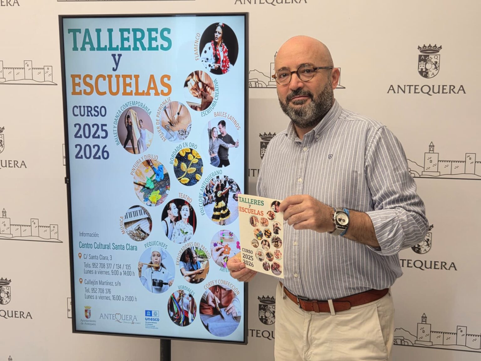 El Ayuntamiento de Antequera, a través del Área de Cultura, ha dado a conocer en la mañana de hoy jueves 18 de septiembre la programación de talleres y escuelas municipales correspondientes al curso 2025-2026. La presentación ha estado a cargo del concejal de Cultura, José Medina Galeote, quien ha destacado la “oferta ingente y variada” que el consistorio pone a disposición de la ciudadanía para complementar su formación no reglada y enriquecer su tiempo de ocio.