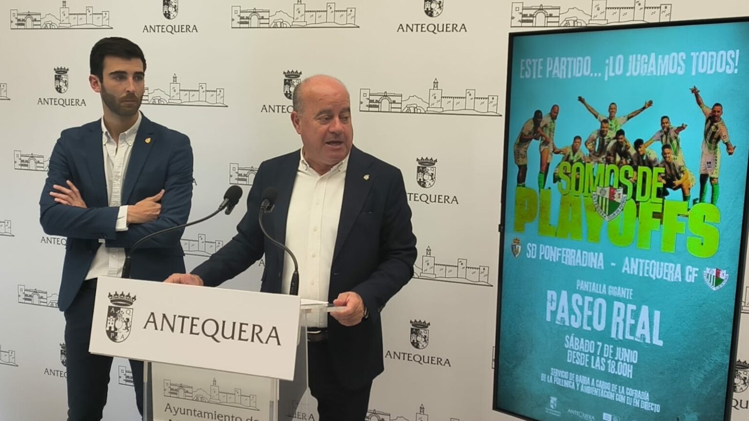 El Ayuntamiento de Antequera instalará este sábado 7 de junio una pantalla gigante en el Paseo Real para seguir en directo el encuentro entre la SD Ponferradina y el Antequera CF, correspondiente a la vuelta de la semifinal del playoff de ascenso a Segunda División. Desde las 18:00 horas habrá barra a cargo de la Cofradía de la Pollinica y música en directo con DJ