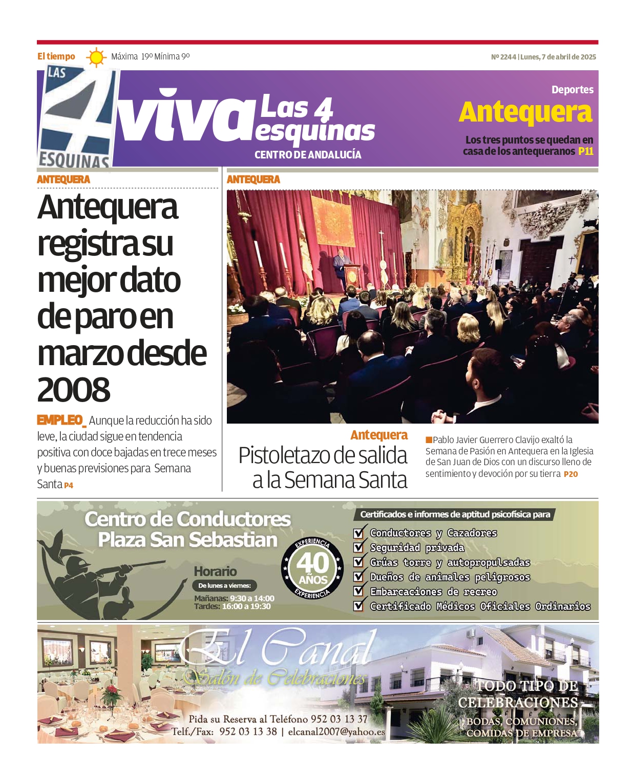 Actualidad|Publicaciones>Periódicos Periódico | VIVA Las 4 Esquinas 7 abril – Antequera registra su mejor dato de paro en marzo desde 2008 Última actualización 7 de abril de 2025 07:56 admin Compartir Compartir Pincha aquí para leer gratis nuestro periódico Comparte este artículo Facebook Copiar link Imprimir Últimas noticias Antequera hace entrega de los premios del Concurso Municipal de Belenes ‘Manuel Grau’ 24 de diciembre de 2025 Entregados los premios del Concurso de Christmas en las Pedanías de Antequera 2025 23 de diciembre de 2025 Dcoop refuerza su compromiso con la reducción de emisiones en toda su actividad 23 de diciembre de 2025 Juan de Dios Mora, ganador del cheque de 3.000 euros por comprar en el comercio local de Antequera 23 de diciembre de 2025 Archidona premia la excelencia en la tradición y el comercio en sus concursos de Navidad 23 de diciembre de 2025 Lo más leido Antequera hace entrega de los premios del Concurso Municipal de Belenes ‘Manuel Grau’ 24 de diciembre de 2025 Entregados los premios del Concurso de Christmas en las Pedanías de Antequera 2025 23 de diciembre de 2025 Dcoop refuerza su compromiso con la reducción de emisiones en toda su actividad 23 de diciembre de 2025 Juan de Dios Mora, ganador del cheque de 3.000 euros por comprar en el comercio local de Antequera 23 de diciembre de 2025 Archidona premia la excelencia en la tradición y el comercio en sus concursos de Navidad 23 de diciembre de 2025 Síguenos 304.9KMe gusta3MSeguir304.9KPin844.9MSeguir40.5MSuscribirse39.5KSeguir