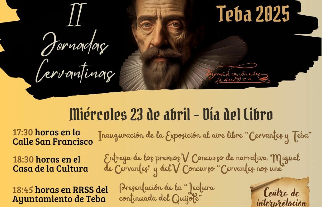 La jornada inaugural, el miércoles 23 de abril, comenzará a las cinco y media con la exposición al aire libre ‘Cervantes y Teba’, ubicada en la calle San Francisco. A las seis y media, la Casa de la Cultura acogerá la entrega de premios del V Concurso de narrativa ‘Miguel de Cervantes’ y del V Concurso ‘Cervantes nos une’.