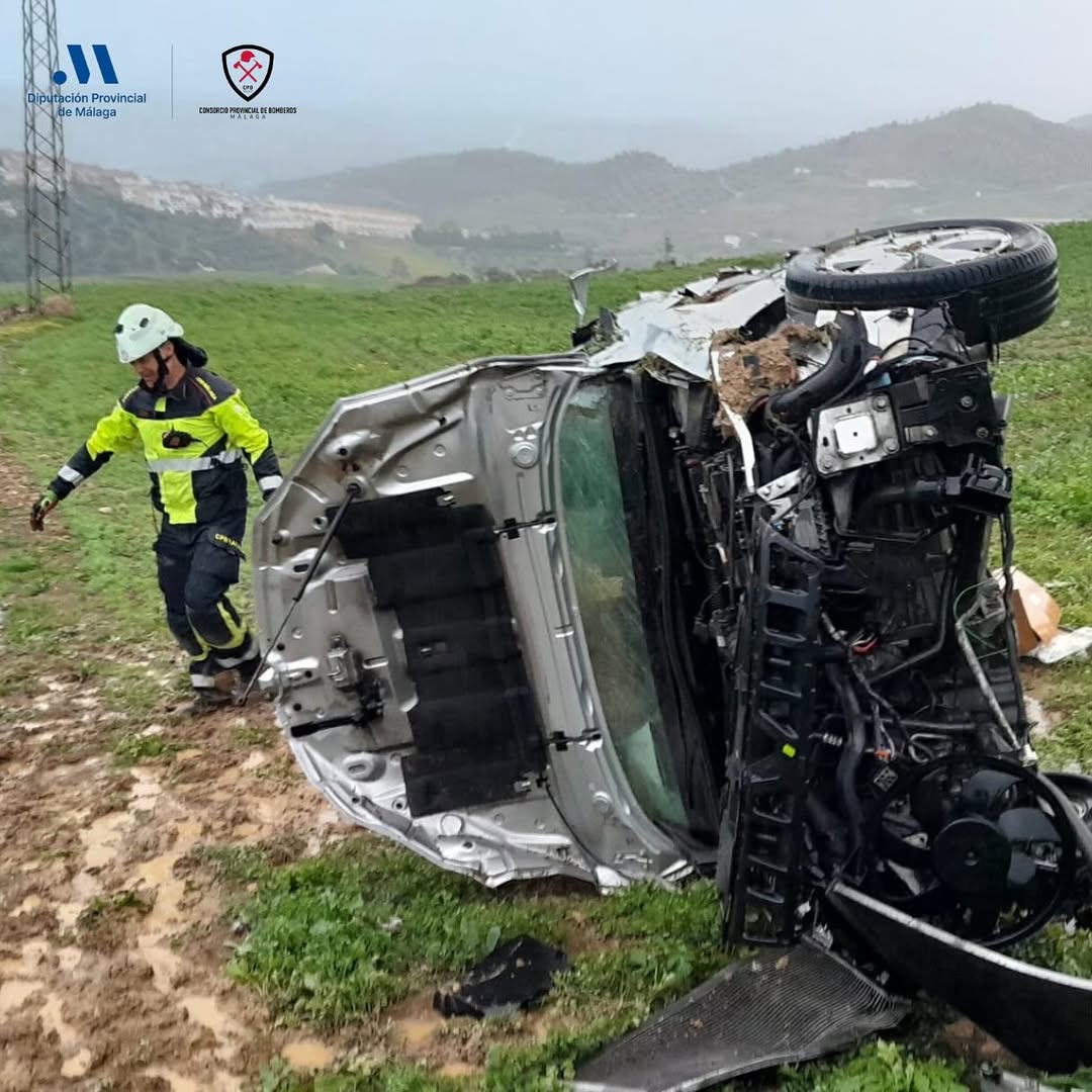 Una dotación de bomberos de Campillos acudió al auxilio del conductor. Aunque no hubo que excarcelarlo, le ayudaron a salir del coche y lo portearon hasta la ambulancia para ser atendido por los servicios sanitarios.