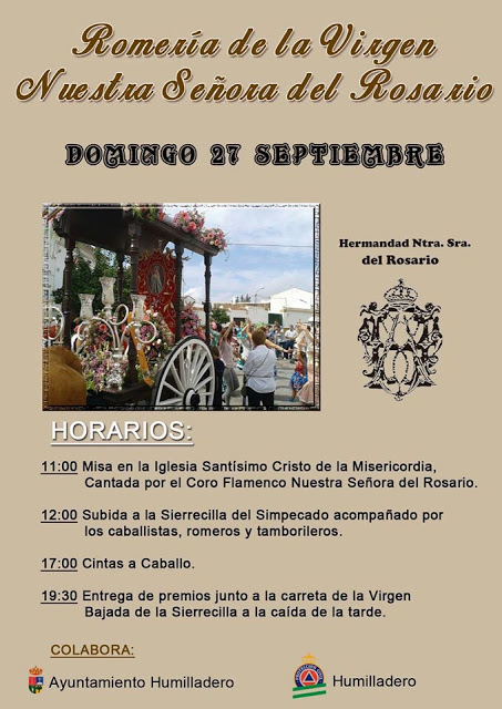 Este domingo la Iglesia del Cristo de la Misericordia de Humilladero acogerá Solemne Eucaristía acompañada por el Coro Flamenco Nuestra Señora del Rosario para dar comienzo con la Jornada Romera, en la que a las doce del mediodía dará comienzo la subida a la Sierrecilla con el Simpecado de la Patrona, acompañada por caballistas, tamborileros y romeros.