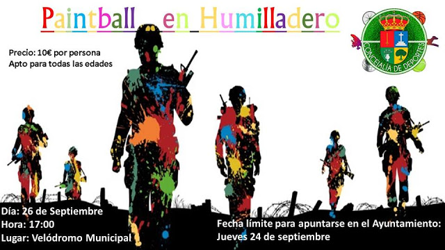 El Ayuntamiento de Humilladero organiza una sesión de Paintball para todos los públicos, con un precio de 10 € por persona. La fecha límite de inscripción es el 24 de septiembre en el Ayuntamiento.