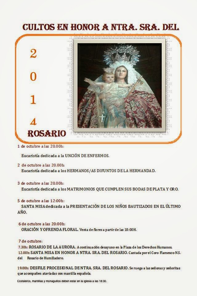 A las 19.00 h, Desfile Procesional de Nuestra Señora del Rosario. Desde la Hermandad se ruegan a las Señoras y Señoritas que acompañen ataviadas con mantilla española. Y citan a costaleros, mantillas y monaguillos que estén en la Iglesia a las 18.30 horas. Los costaleros pueden comprar su camisa bordada con el escudo de la hermandad en el horario de los triduos, o el mismo día de la procesión. Su precio es de 18€. Los monaguillos podrán recoger sus trajes en Patro Flamenca lo antes posible.