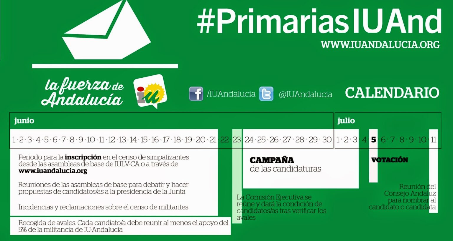 La campaña de las candidaturas elegidas se desarrollará desde el 23 de junio al 3 de julio, para celebrarse la votación el 5 de julio, y conocer al candidato de IU el 11 de julio, cuando se procederá al nombramiento en la reunión del Consejo Andaluz.