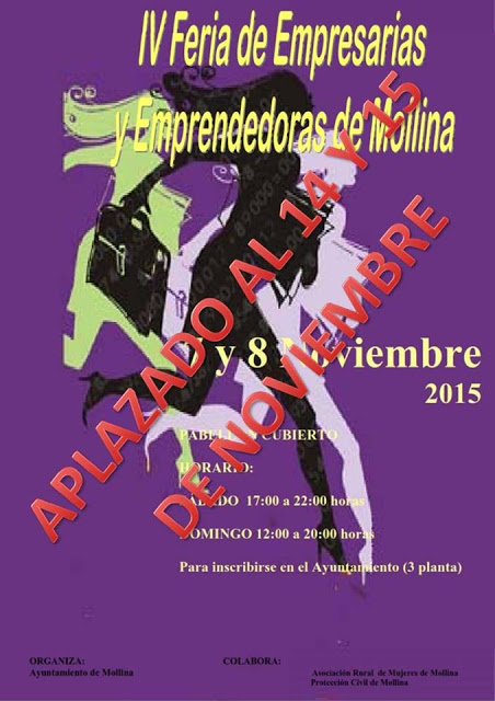 Por motivos organizativos la feria de mujeres empresarias se aplaza al fin de semana del 14 y 15 de noviembre. El plazo de inscripción para las mujeres empresarias interesadas en participar, es hasta el jueves 29 de octubre.