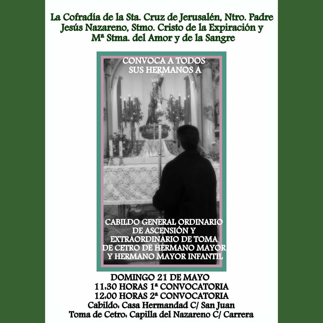 La Cofradía convoca a sus hermanos a Cabildo General Ordinario de Ascensión y Extraordinario de Elecciones este próximo sábado 27 de mayo en su Casa Hermandad, a las 10.30 en primera convocatoria y a las 11.00 horas en segunda.