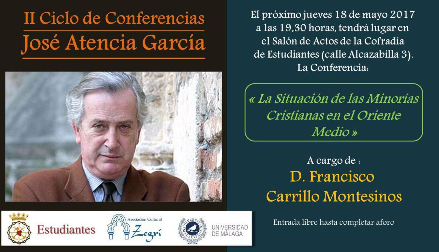 • 1.      II Ciclo de Conferencias D. José Atencia; “La situación de las minorías cristianas en el Oriente Medio”, a cargo de D. Francisco Carrillo Montesinos (jueves 18 de mayo, a las 19.30h – Casa Hermandad), en colaboración con la Asociación Cultural Zegrí y la Universidad de Málaga. Entrada libre hasta completar aforo.