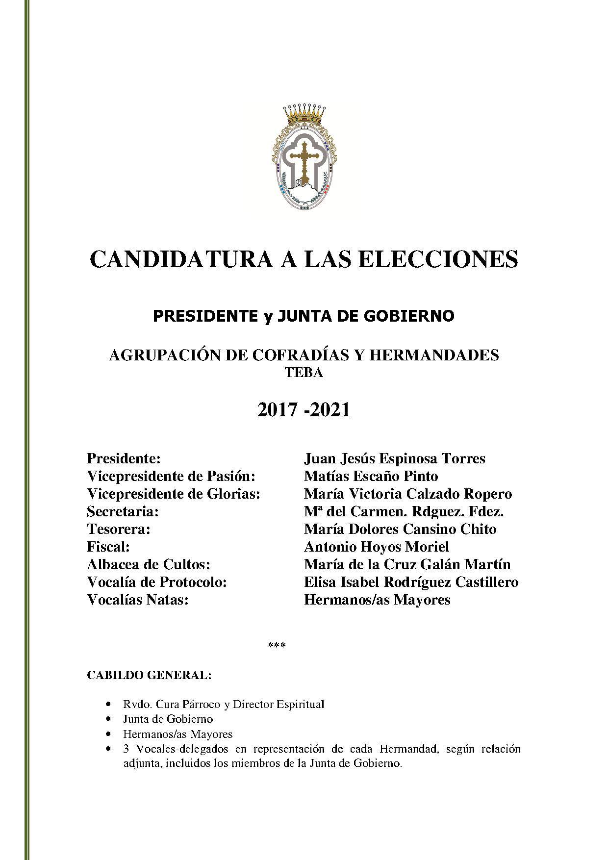 De esta forma Juan Jesús Espinosa Torres encabezaría dicha candidatura acompañado por Matías Escaño como vicepresidente de Pasión, Maria Victoria Calzado, vicepresidente de Glorias. María del Carmen Rodríguez de Secretaria, Maria Dolores Cansino de Tesorera, Antonio Hoyos de Fiscal, Maria de la Cruz Galán como Albacea de Cultos, Elisa Isabel Rodríguez como voocal de Protocolo y como vocales los diferentes hermanos mayores.