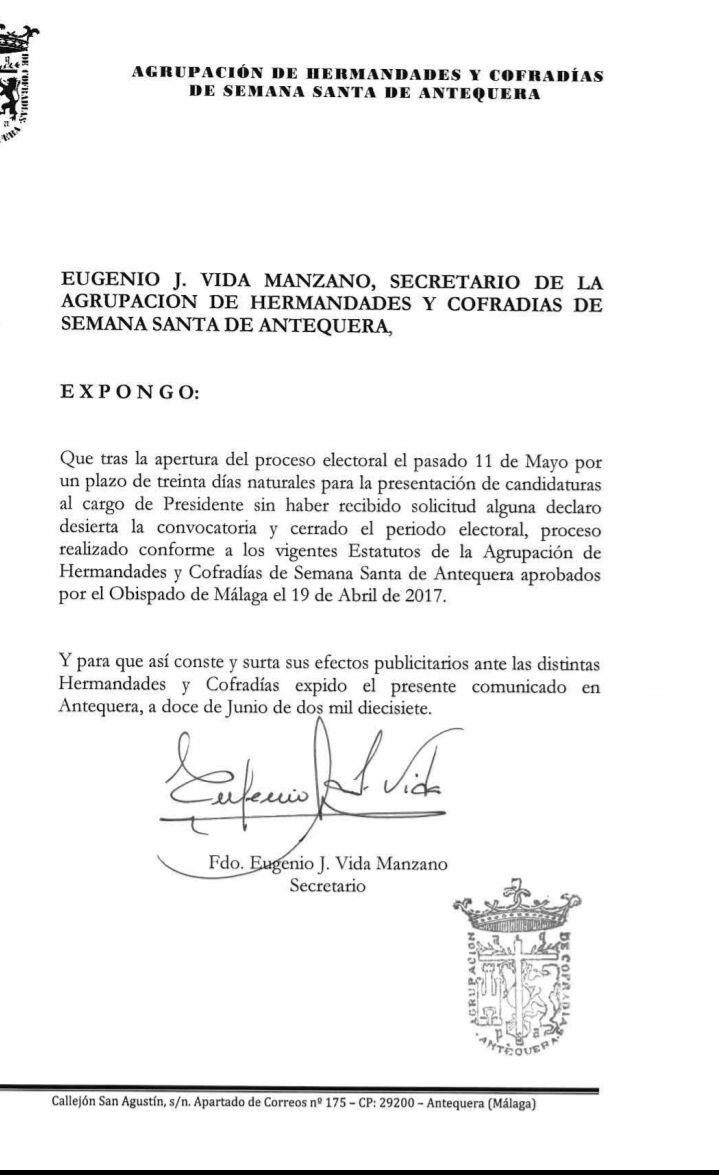 La Agrupación de Hermandades y Cofradías de la Semana Santa de Antequera, por medio de su secretario, D. Eugenio Vida, comunica que ha finalizado el plazo de presentación de candidaturas para la elección a Presidente a dicho órgano.