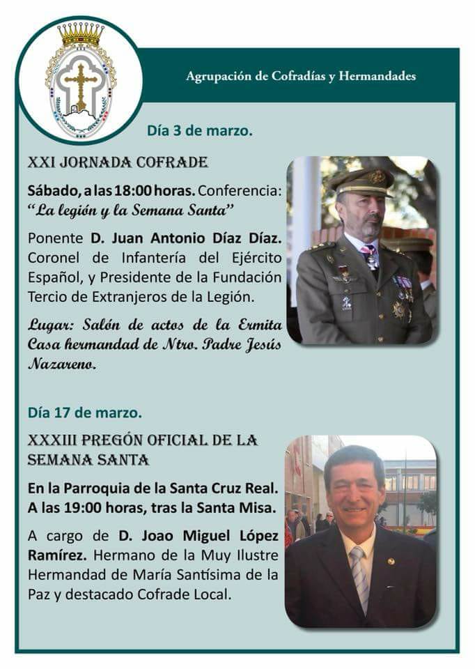• 31ª Jornada Cofrade que tendrá lugar el sábado 3 de marzo a las 18.00 horas con el lema “La legión y la Semana Santa”, el ponente será Juan Antonio Díaz Díaz, Coronel de Infanteria del Ejercito Español y presidente de la Fundación Tercio de Extranjeros de la Legión. El acto tendrá lugar en el Salón de Actos de la Ermita Casa Hermandad de Nuestro Padre Jesús Nazareno.